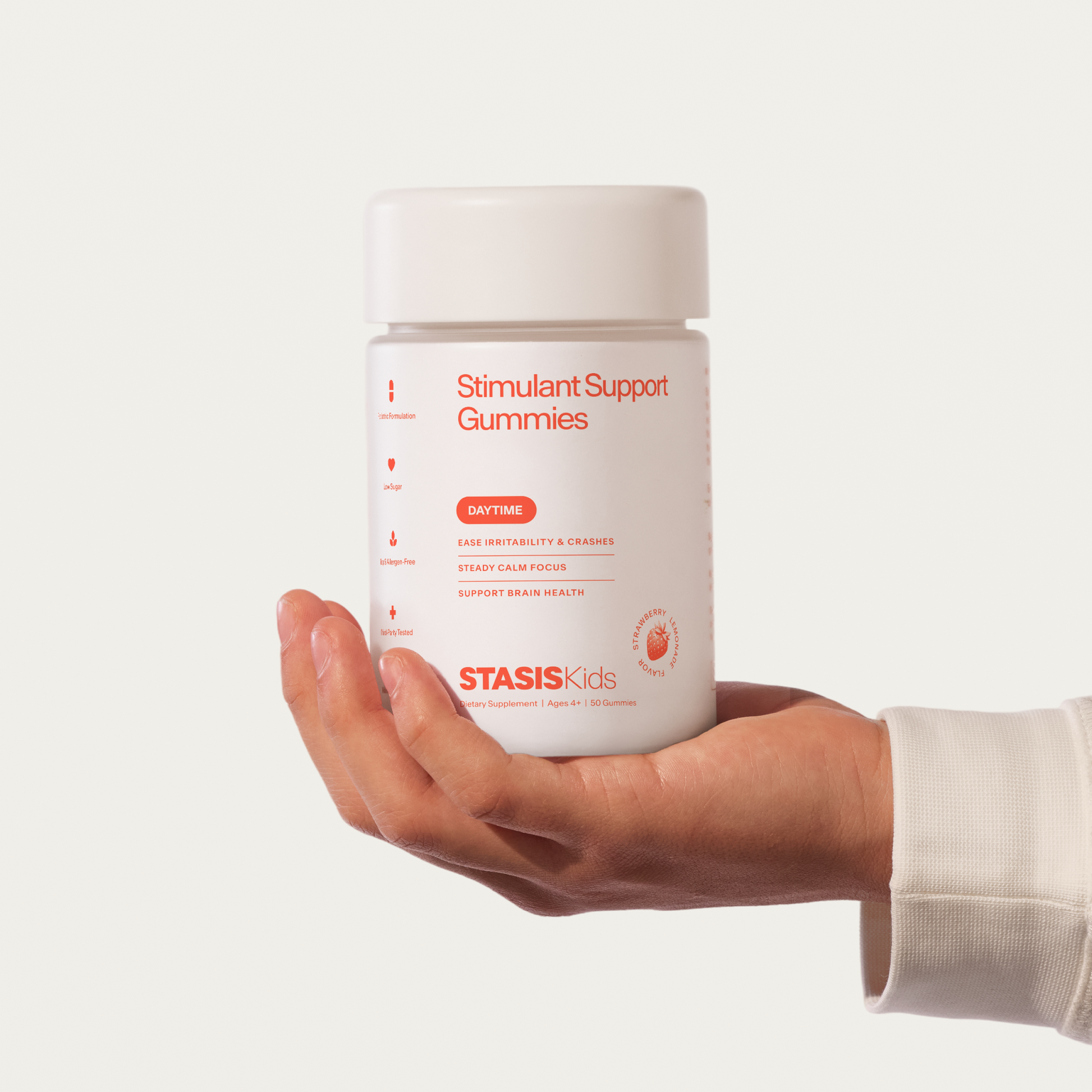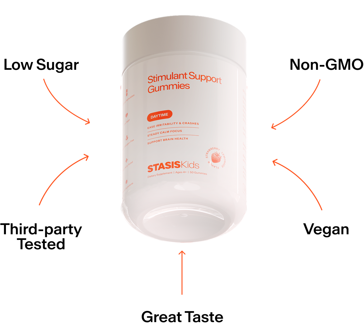 Stasis Kids is a pediatrician-trusted daily gummy that is designed to be taken with your child's stimulant to ease crashes and support emotional balance.